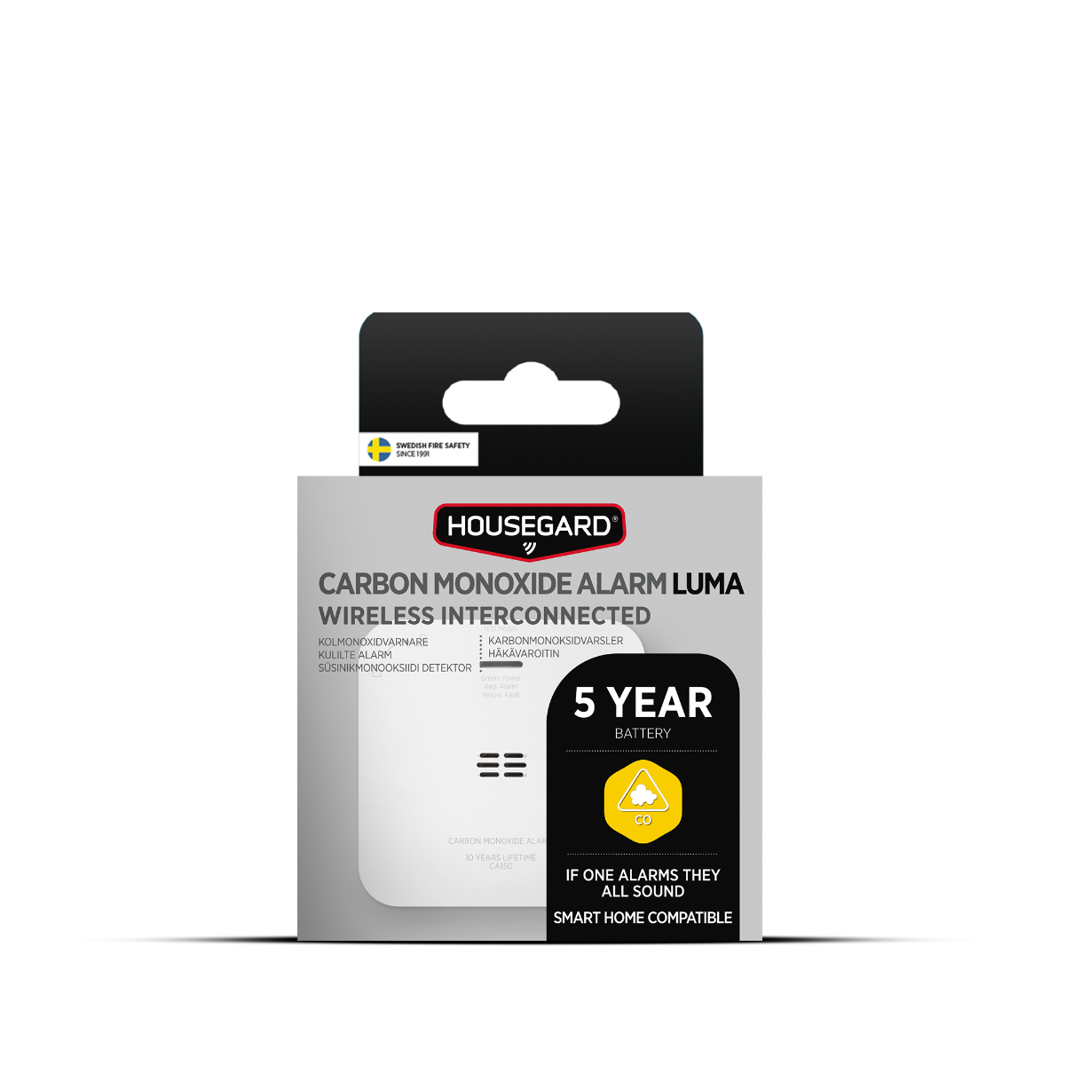 VARSLER ÉN, VARSLER ALLE. Rask varsling ved farlige nivåer av karbonmonoksid fra ved- og gassovner, ved- og gasskomfyr, grill, etc. Kan kobles i serie med opptil 40 enheter. Gjennom Luma Hub (kjøpes separat) kan du også motta varsler på telefonen din.