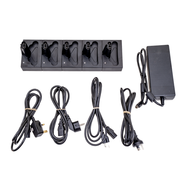 5-ports multilader for batterier til CleanAIR 2f vifteenhet. Laderen kan ladde opptil 5 batterier samtidig, og inkluderer strømforsyning og AC-kabler.