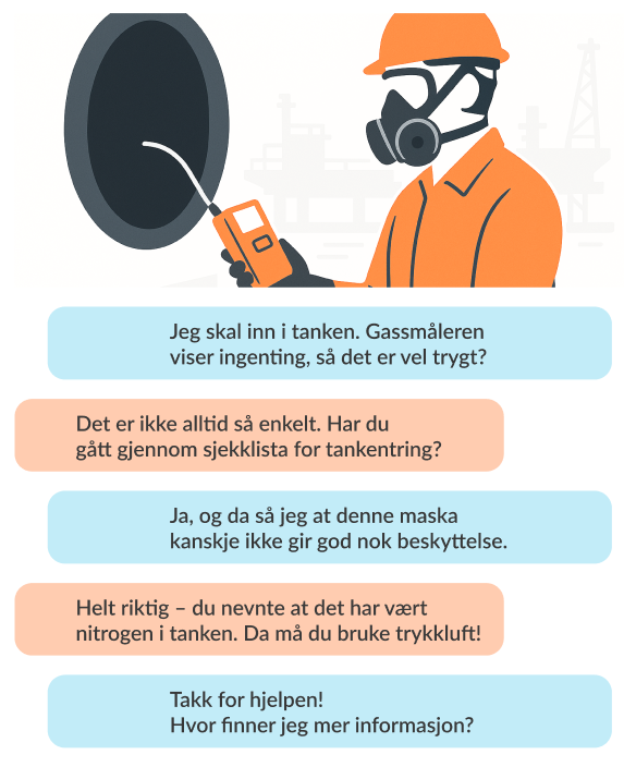 Slik sikrer du deg mot oksygenmangel og farlige gasser under tankarbeid.