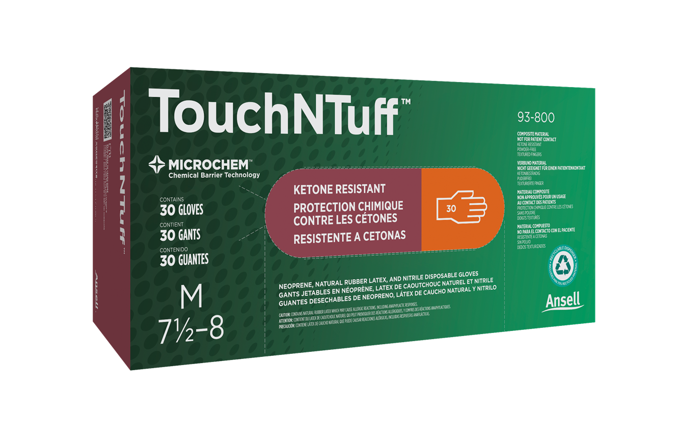 TouchNTuff 93-800 er den første engangshansken på markedet som gir motstand mot aceton i minst 15 minutter. Den gir opptil 15 ganger lengre beskyttelse mot aceton sammenlignet med standard engangshansker i nitril. Hansken er utviklet med en innovativ flerlagskonstruksjon basert på MICROCHEM™ Chemical Barrier teknologi, som gir kjemikalieresistens på Type A-nivå uten at naturgummilateks kommer i direkte kontakt med huden. Dette gjør at brukeren får høy kjemisk beskyttelse uten behov for å bruke flere hansker samtidig.