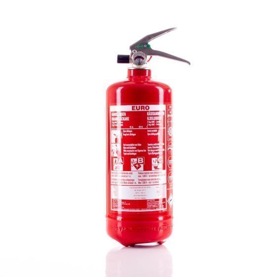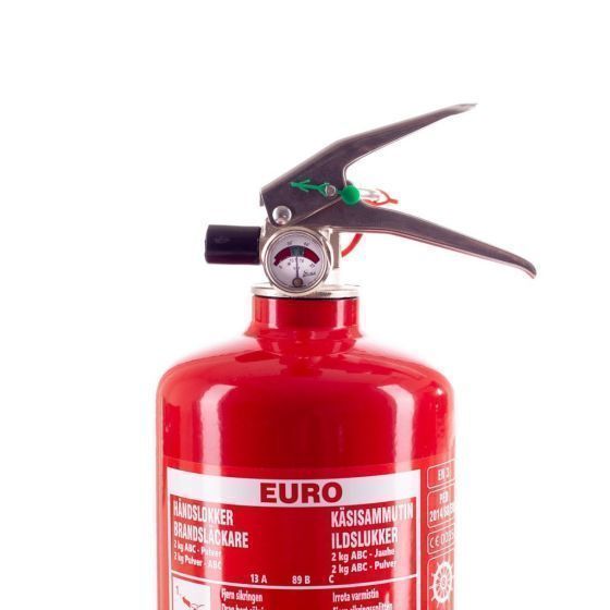EURO 2 kg ABC-slukker EURO ABC er vår mest prisvennlige brannslukker. Pulverslukkeren er effektiv på brann av klasse A, B og C. Brannslukkeren er trykkladet med testventil bak trykkmåleren for enkelt vedlikehold.