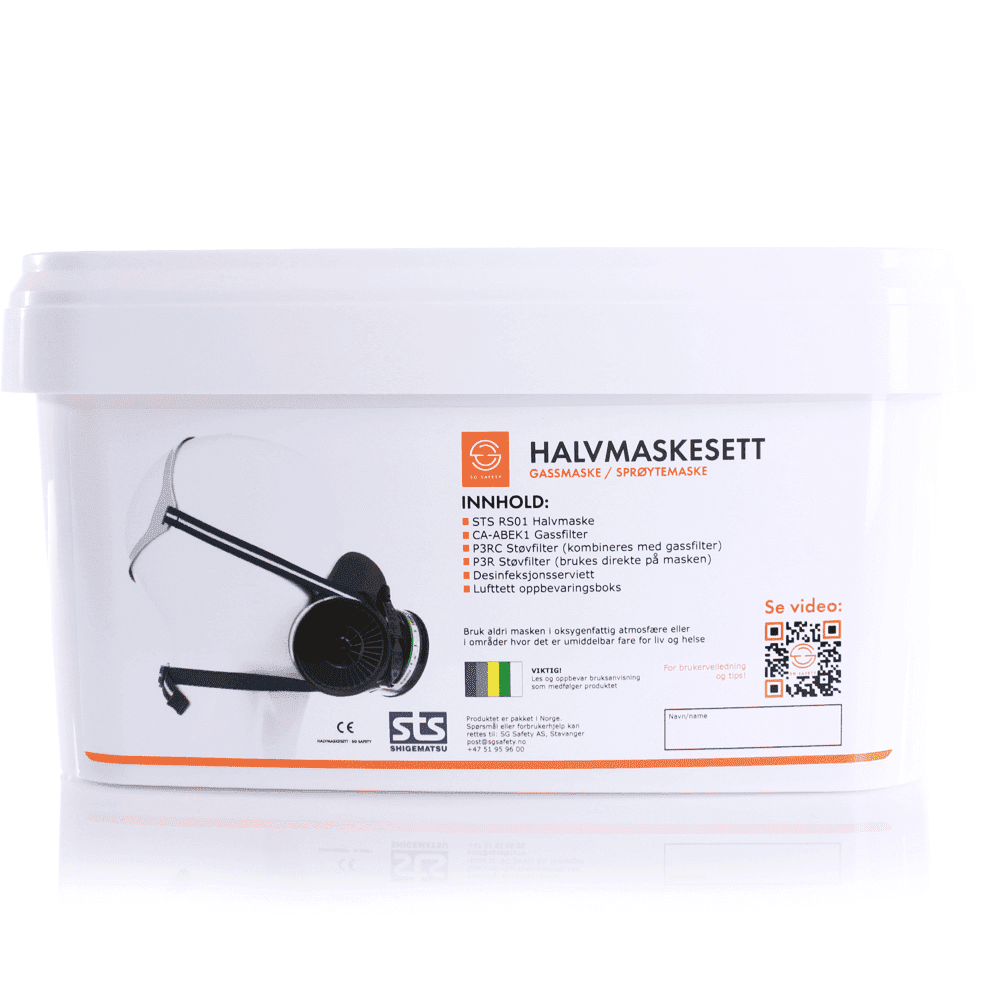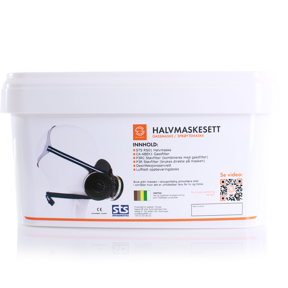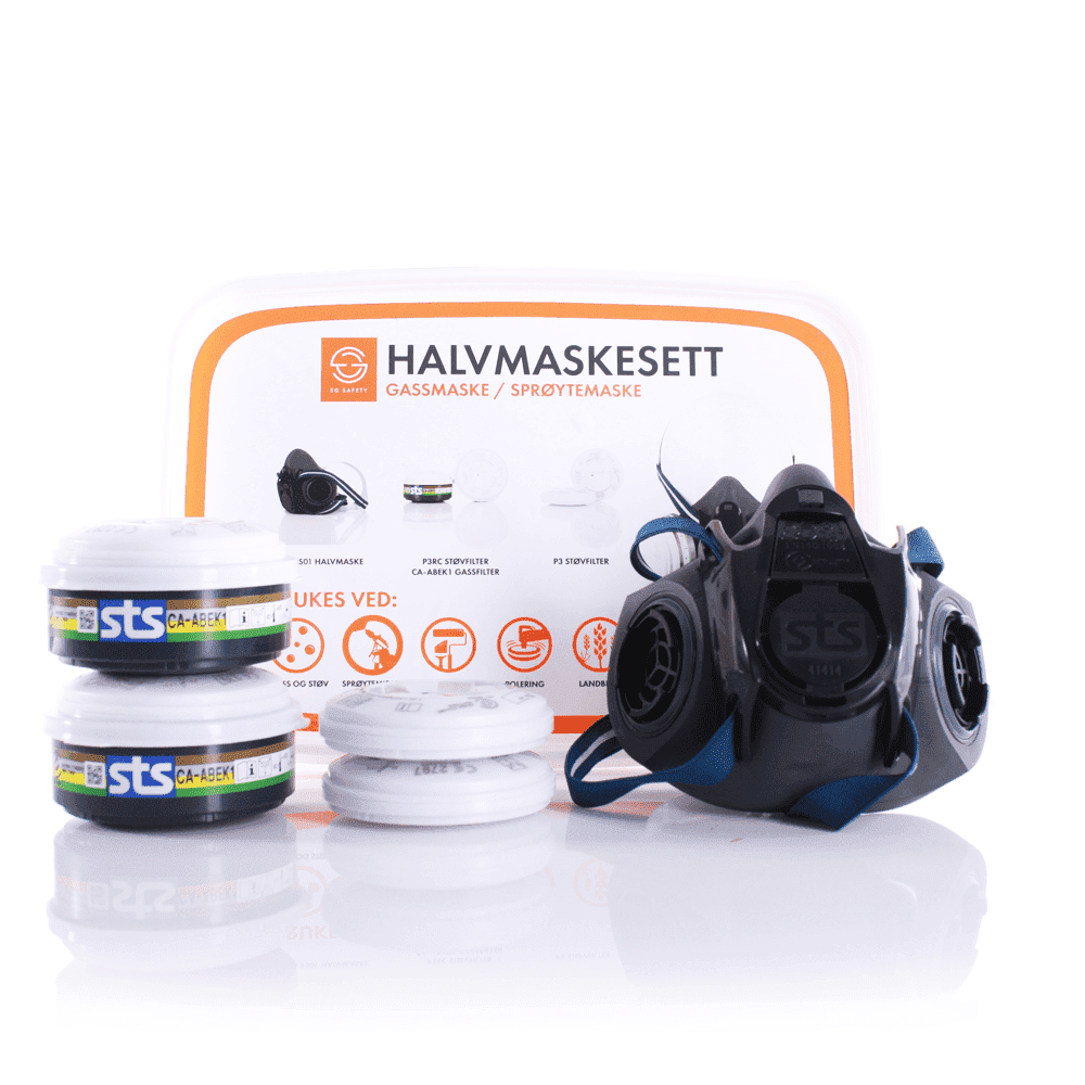 Maskesettet inneholder halvmaske, gassfilter og støvfilter, samt rengjøringsserviett. Settet kommer ferdig pakket i en praktisk og lufttett oppbevaringsboks for hygienisk og enkel oppbevaring. Filtrene monteres enkelt på masken. Støvfilter kan klikkes på gassfilteret for kombinert beskyttelse.