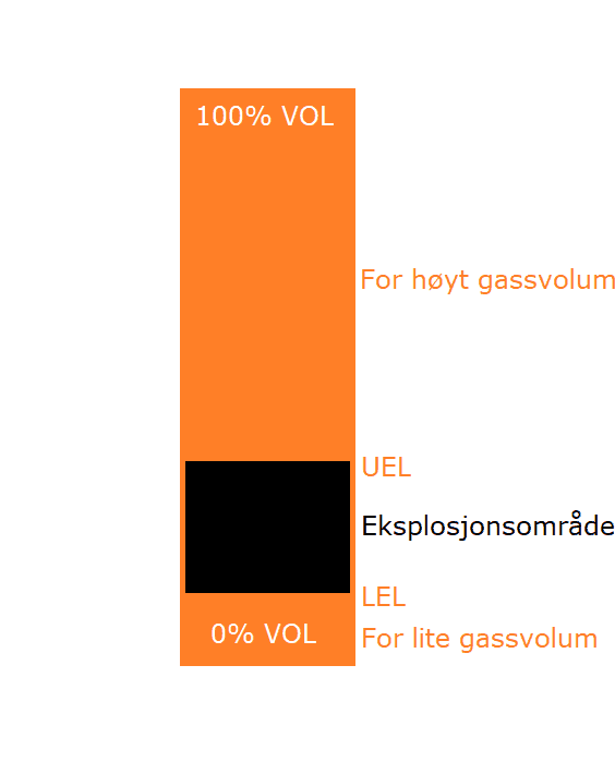 LEL står for "Lower Explosive Limit" - nedre eksplosjonsgrense, mens UEL representerer øvre eksplosjonsgrense. Når konsentrasjonen av brennbar gass ligger mellom disse to grensene er vi i brennbarhetsområdet - eller eksplosjonsområdet. Da risikerer atmosfæren å antenne dersom det oppstår en gnist.