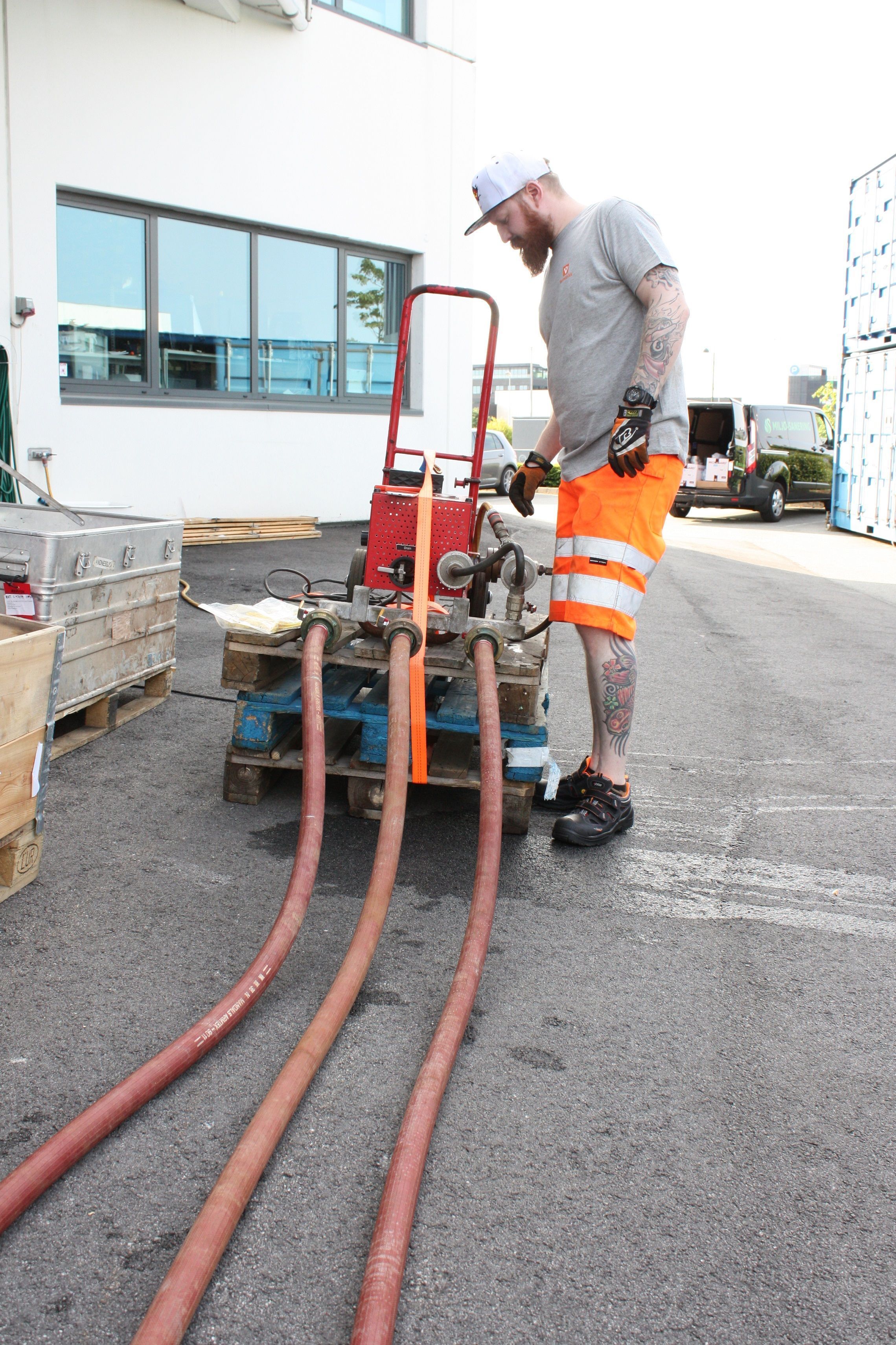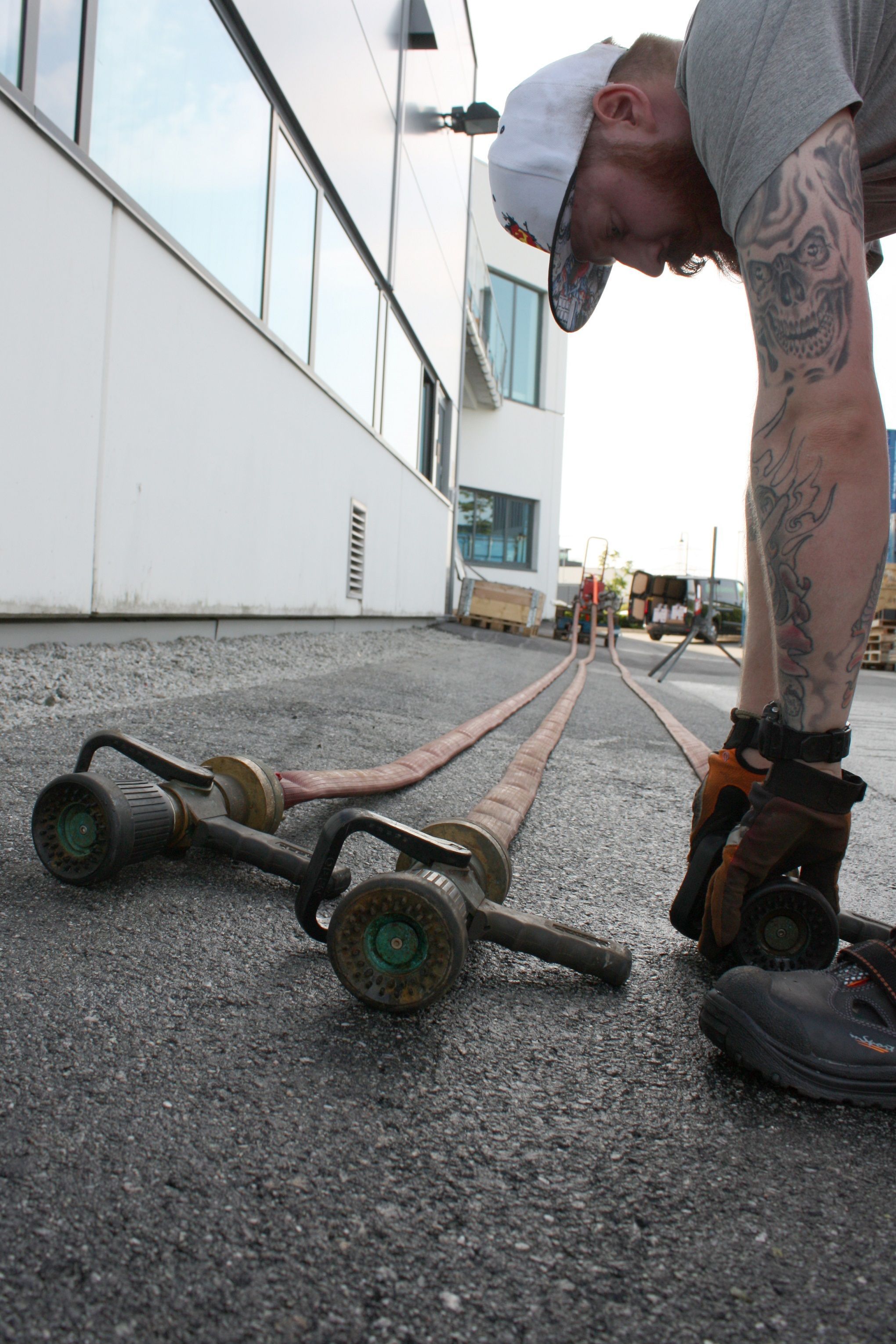 Etter trykktesting rulles slangene ordentlig sammen og legges tilbake i pall før merking med årets farge.