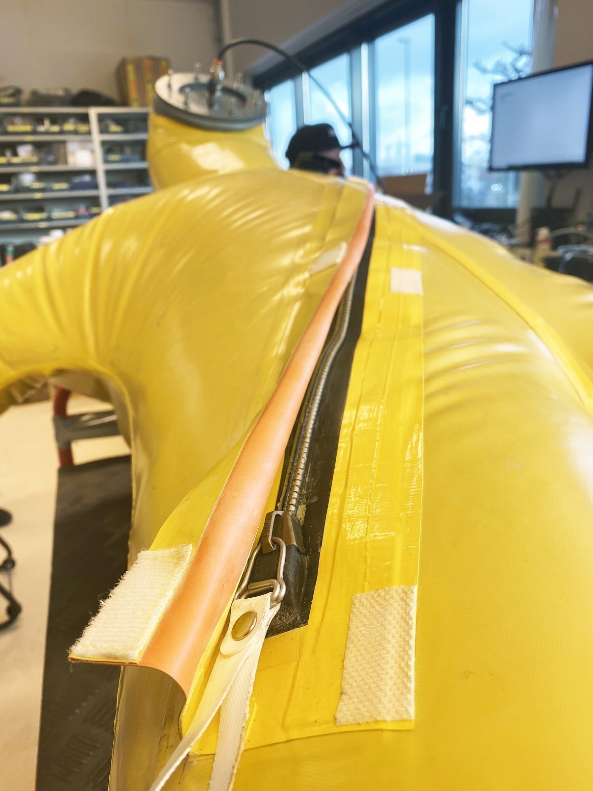 Når drakten er ren og tørr, fortsetter vi med visuell inspeksjon. Her saumfarer vi draktens overflate både på innsiden og utsiden. Vi ser etter kutt og rifter, og i endringer i overflaten. Glidelås og O-ringer smøres. Dersom draktmodellen har innerhansker, bytter vi disse. Gummihanskene (ytterhanskene) skiftes dersom hanskene har vært i kontakt med kjemikalier.